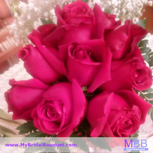 Design in preserved roses for bridesmaids with a lot of intense pink color. Bows and rhinestones.